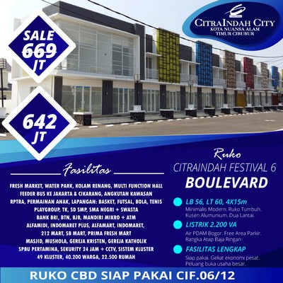 1 unit lagi ruko CitraIndah Festival 6 di perumahan CitraIndah, Ciputra Group. Ruko Sudah selesai dibangun. Ruko bisa serah terima dan langsung dipakai usaha. Memiliki dua lantai. Ada sisa tanah di belakang sehingga bisa dialokasikan baik untuk perluasan ruangan ruko, gudang atau keperluan lain. Bonus area parkir luas. Harga, lihat di Harga CitraIndah City